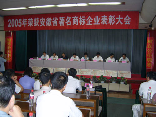 2006年7月26日下午,馬鞍山市2005年獲省著名商標企業(yè)表彰大會在市政府東二樓會議室舉行,出席本 次會議的主要領(lǐng)導有省工商局副局長黃家華、市人大常委會副主任杜永田、市政府副市長劉榮華、市政協(xié) 副主席孫文植、市政府副秘書長王興無、省工商局商標局局長劉國建等。