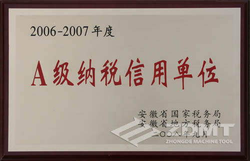 近日,安徽省國(guó)家稅務(wù)局、地方稅務(wù)局聯(lián)合表彰了2006-2007年度納稅信用等級(jí)A級(jí)納稅人,中德機(jī)床也再次被授予了“A級(jí)納稅信用單位”的證書。